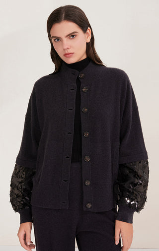 100% Pure Cashmere Embellished Sleeve Knit Cardigan