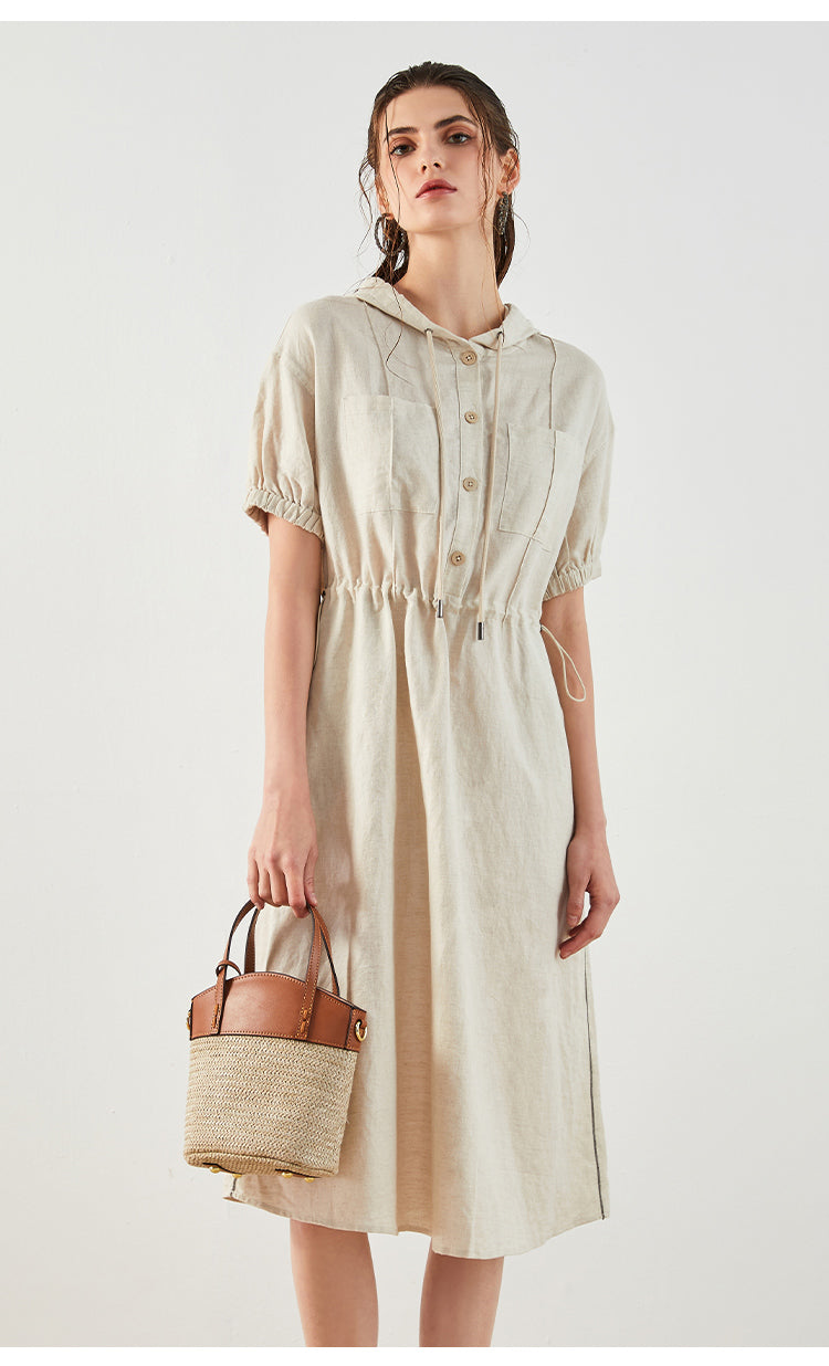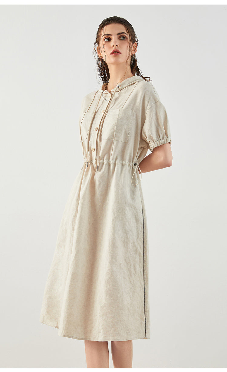 Crafted from natural linen, this dress features a soft beige tone and textured surface that highlight the fabric’s breathable, organic character. The hooded design adds a casual feel, while the short sleeves with gathered cuffs bring subtle volume and charm.