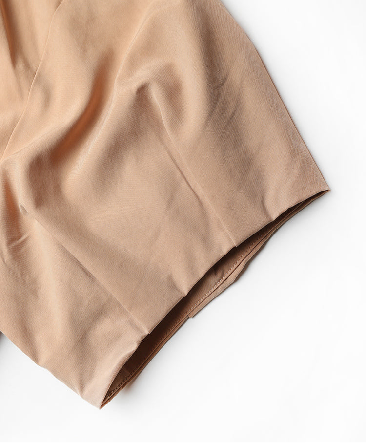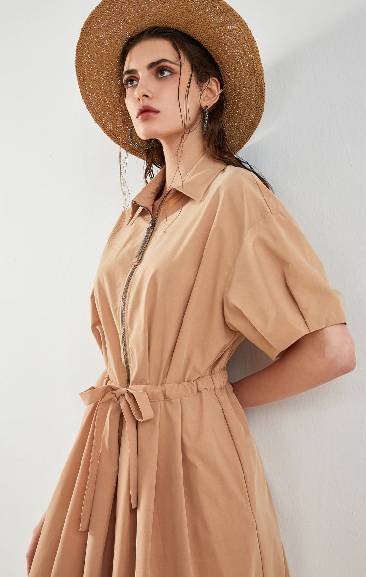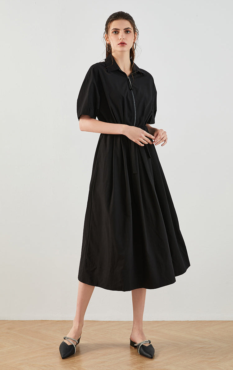 This dress is made from a fabric blend of 65% Tencel and 35% Lycra cotton, combining a smooth, breathable feel with added elasticity and structure. It features a classic shirt collar and loose batwing short sleeves that soften the shoulder line. A front zipper adds crisp detail, while the adjustable waist tie defines the silhouette. The ankle-length full skirt flows naturally for a clean yet relaxed look. Blending comfort, ease, and subtle tailoring, this piece suits both casual and workday settings.