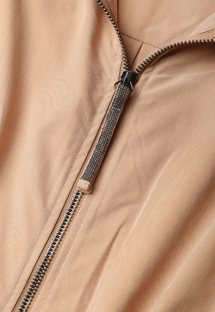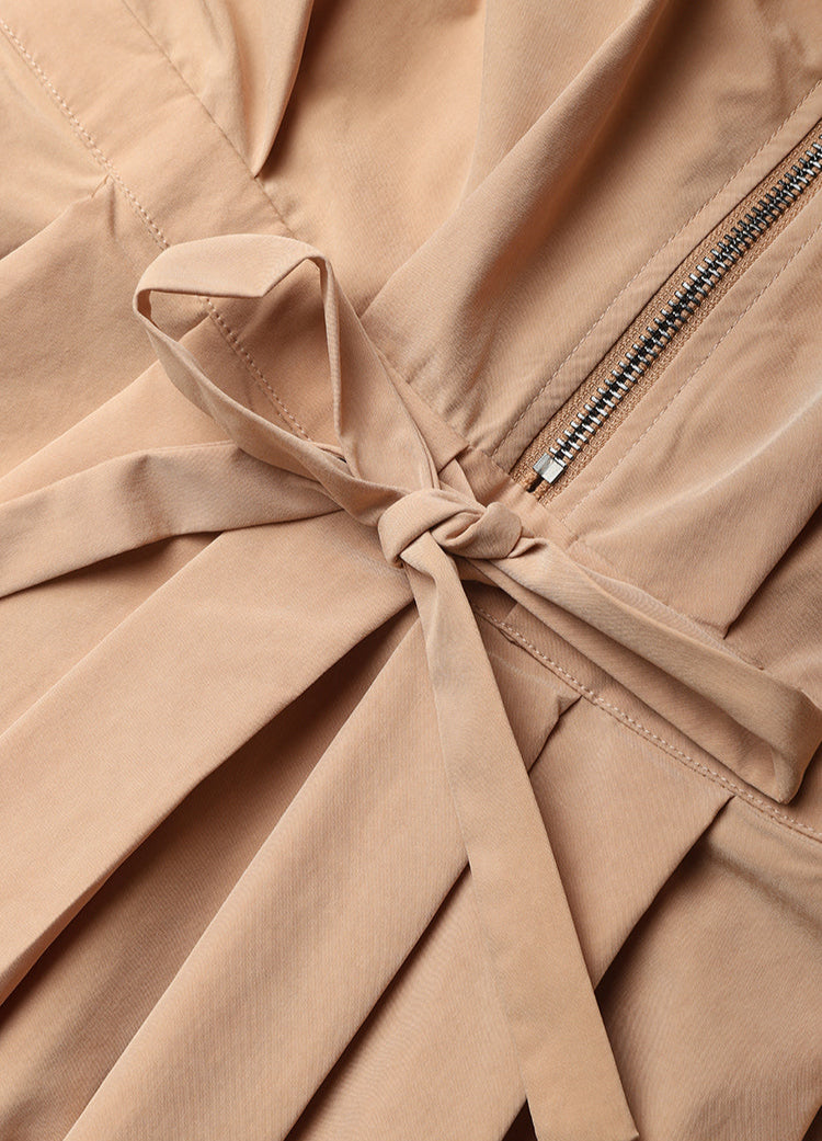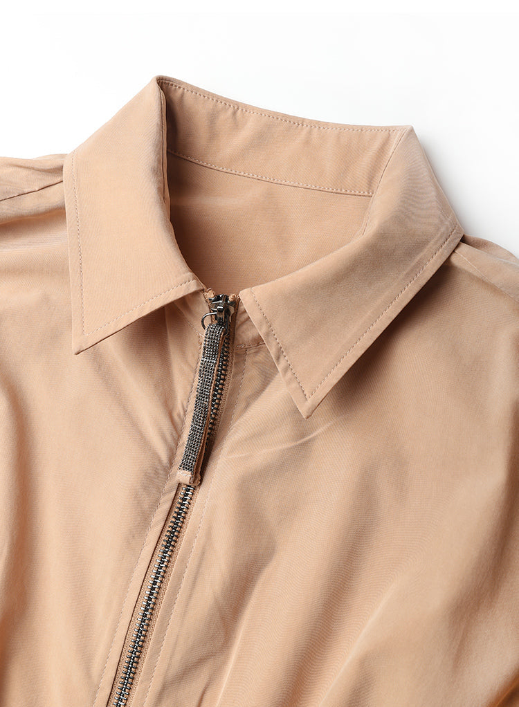 Design: Shirt collar, batwing sleeves, front zip, waist tie