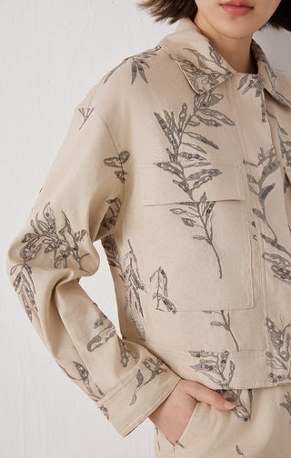 Botanical Print Cropped Linen Blend Jacket Blouses