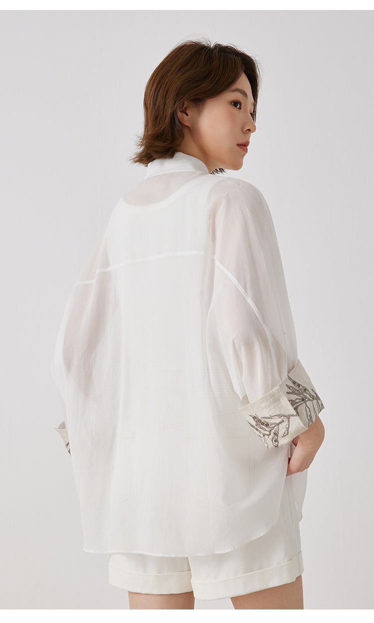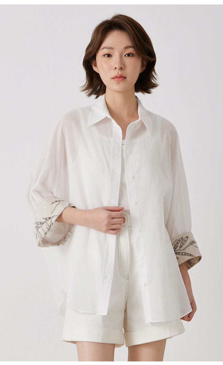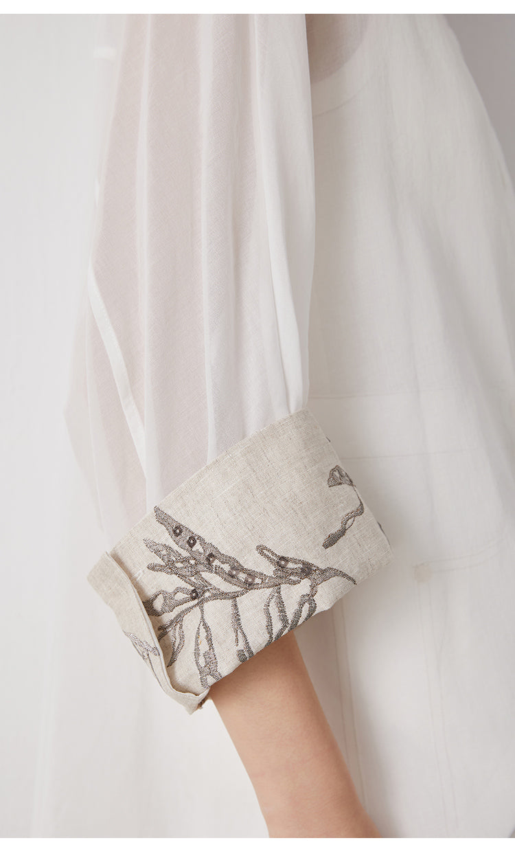 This white Blouses is crafted from 100% long-staple cotton and lined with 100% linen — a thoughtful pairing of two natural materials. The cotton outer layer offers a soft yet structured feel, while the breathable linen lining enhances moisture control and comfort. Designed in a relaxed silhouette with a classic shirt collar, the piece features contrasting fabric cuffs embroidered with subtle shimmer, adding a refined detail to the minimalist look.