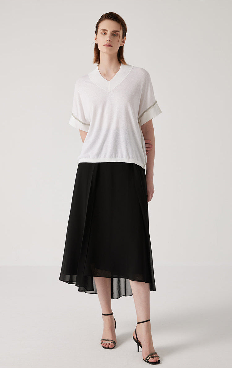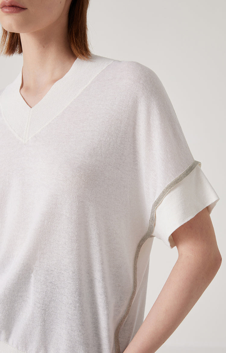 This summer knit top is crafted from a breathable blend of linen,Tencel, and silk. The linen brings a crisp, airy feel, while Tencel adds softness and drape. Silk enhances the texture with a smooth, cool finish and subtle sheen. Designed with a short-sleeve silhouette and a clean neckline, this piece pairs effortlessly with tailored or casual bottoms for the warmer seasons.