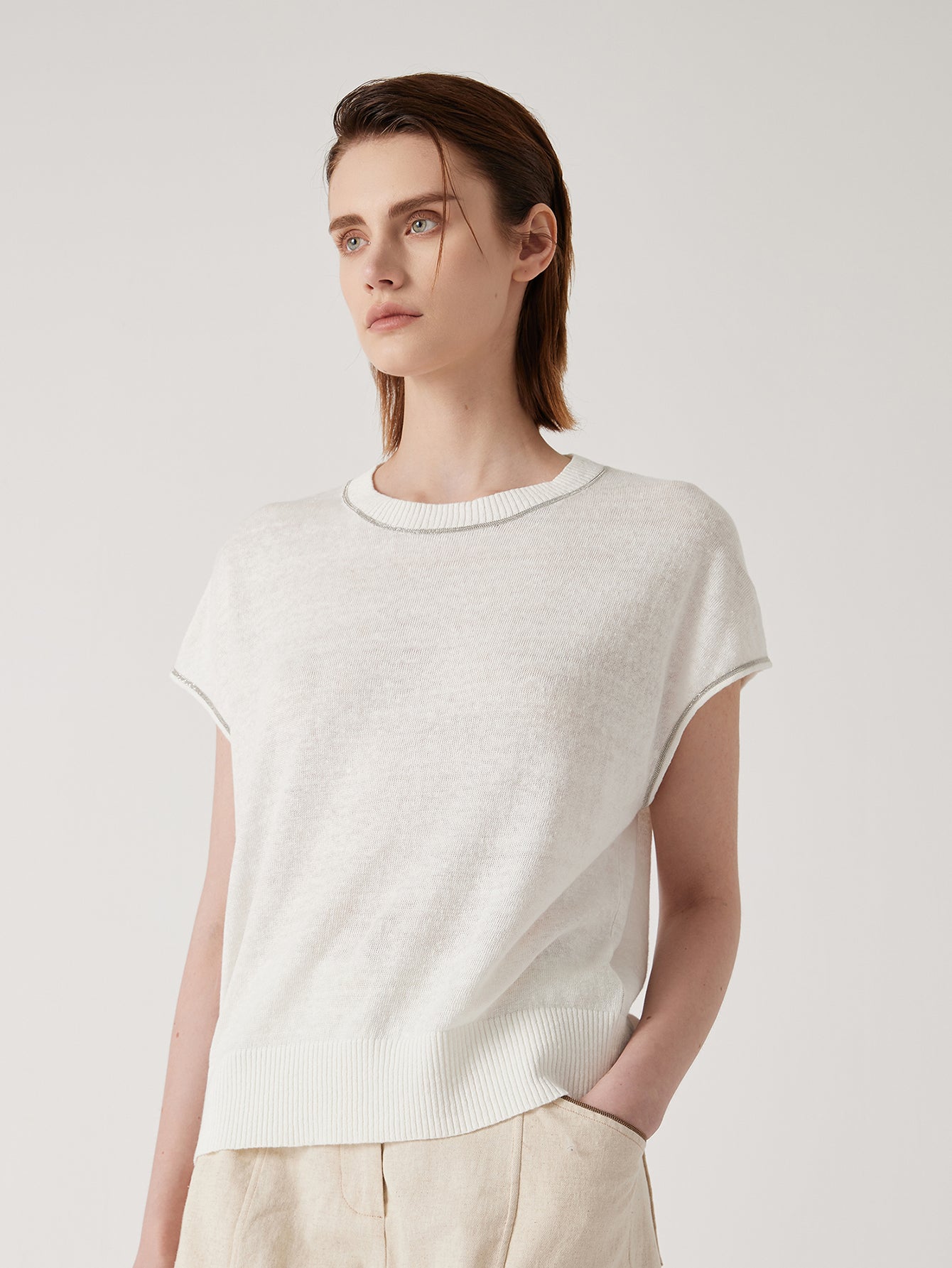 This lightweight top is crafted from a breathable blend of linen, Tencel, and silk, designed for effortless comfort in warmer weather. The natural linen provides a crisp texture, while Tencel adds a smooth drape and silk enhances softness and subtle sheen.