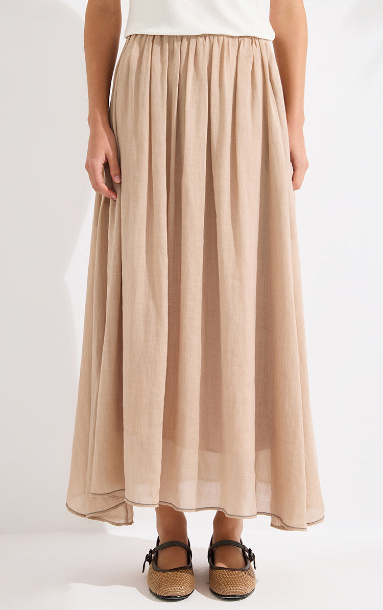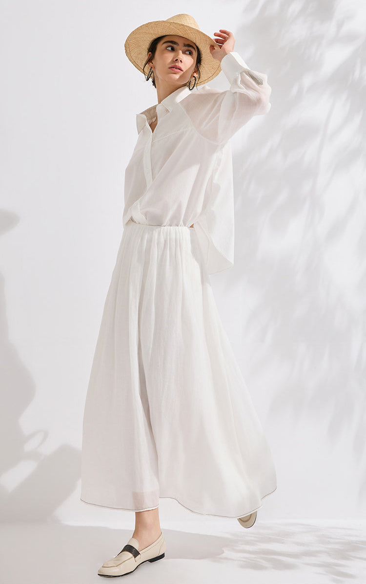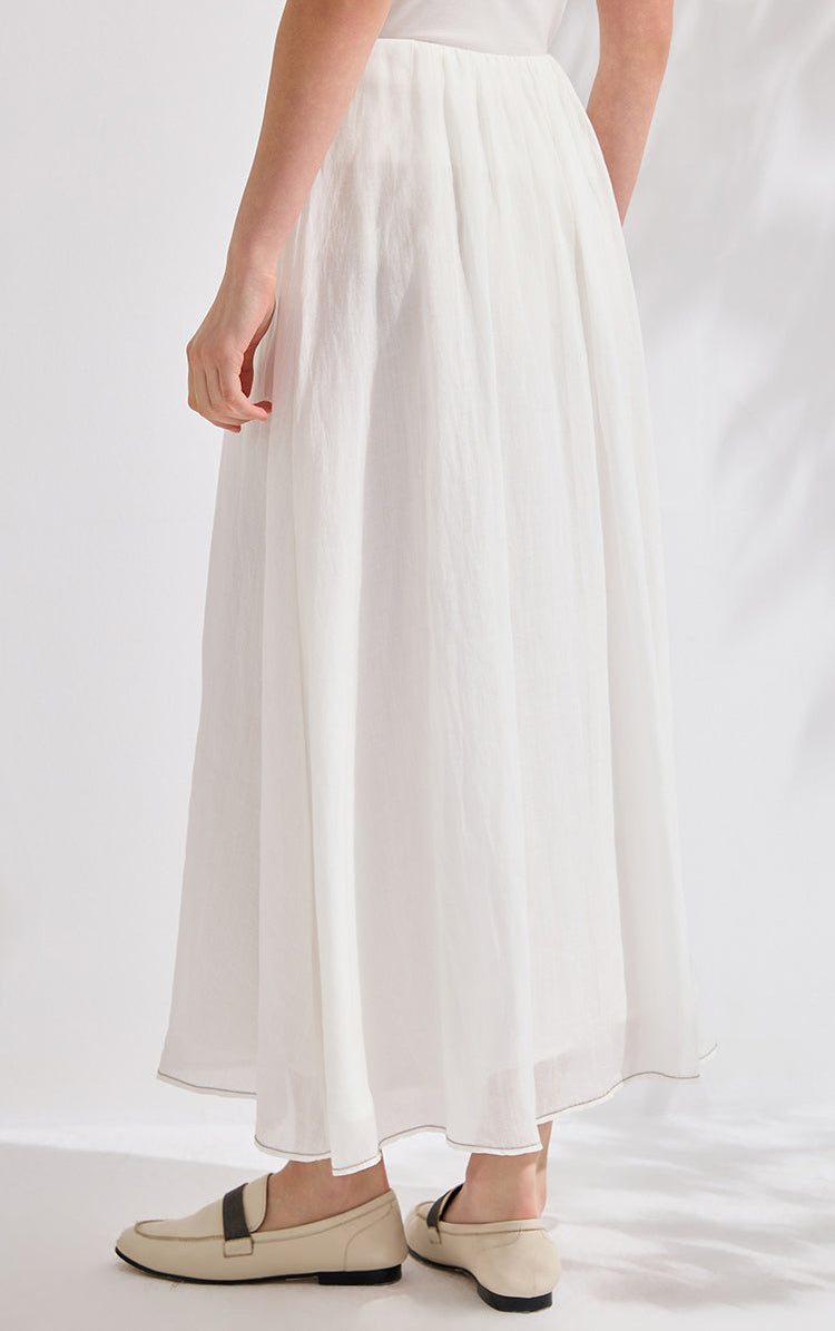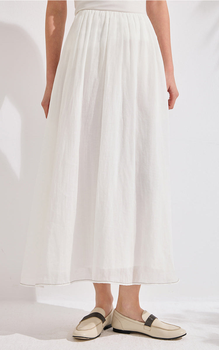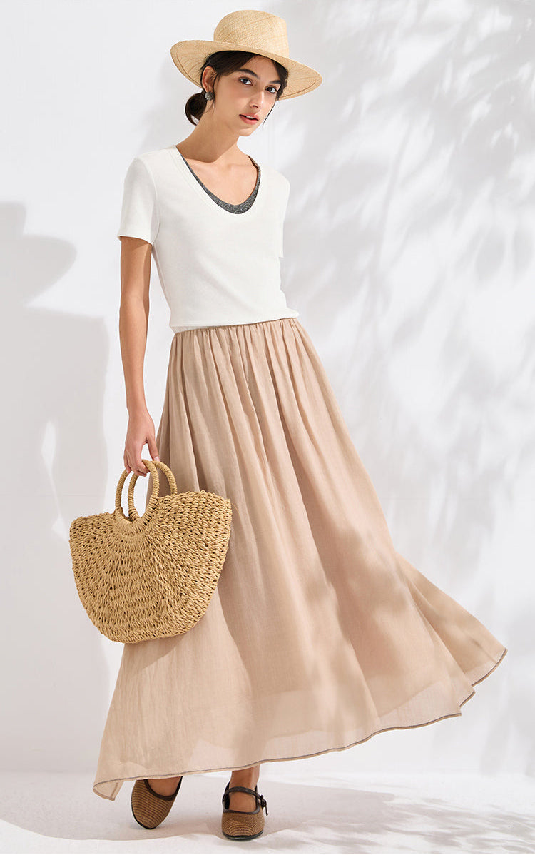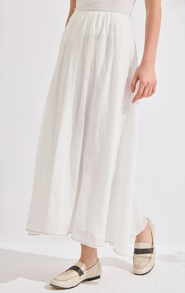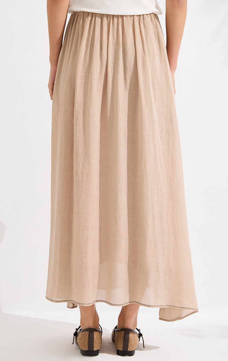 Designed with a fluid drape and an airy presence, this long skirt is crafted from a refined ramie–lyocell blend that feels light, breathable, and naturally textured against the skin. The high-waist A-line silhouette unfolds into a generous sweep, creating graceful movement while subtly elongating the figure. A softly elasticated waistband offers day-long ease without compromising structure, while natural crinkle textures lend depth and dimension. Delicate beaded embroidery tracing the contrast edging introduces a quiet touch of craftsmanship and light-catching detail. Effortless yet composed, it transitions seamlessly from daily wear to travel and relaxed feminine styling.