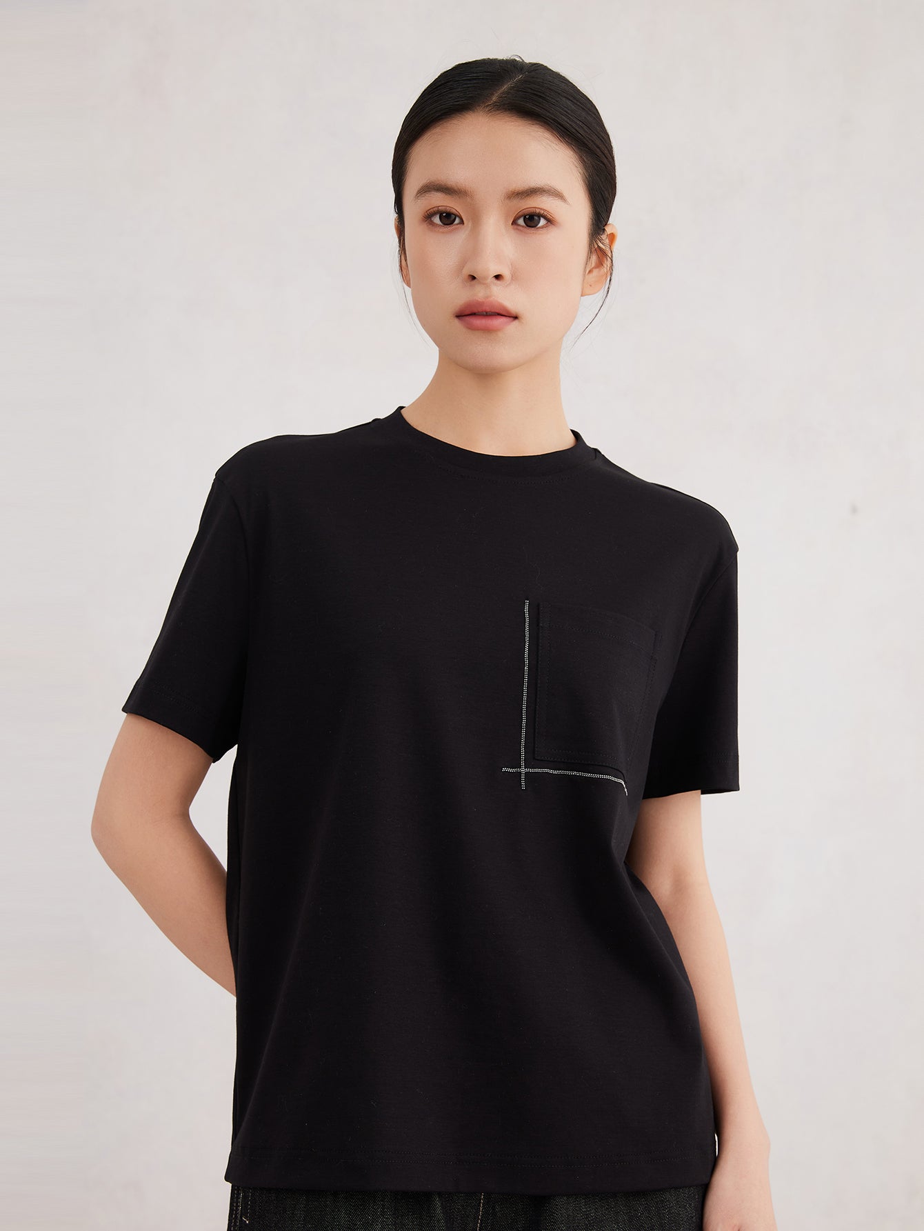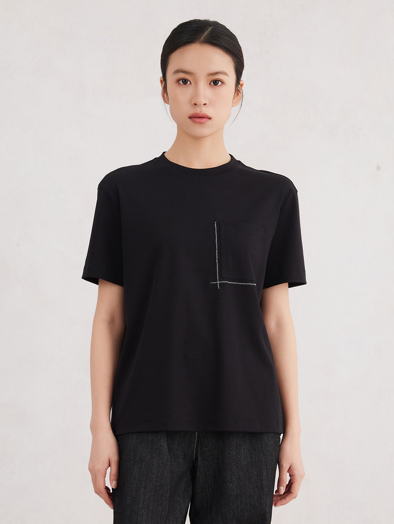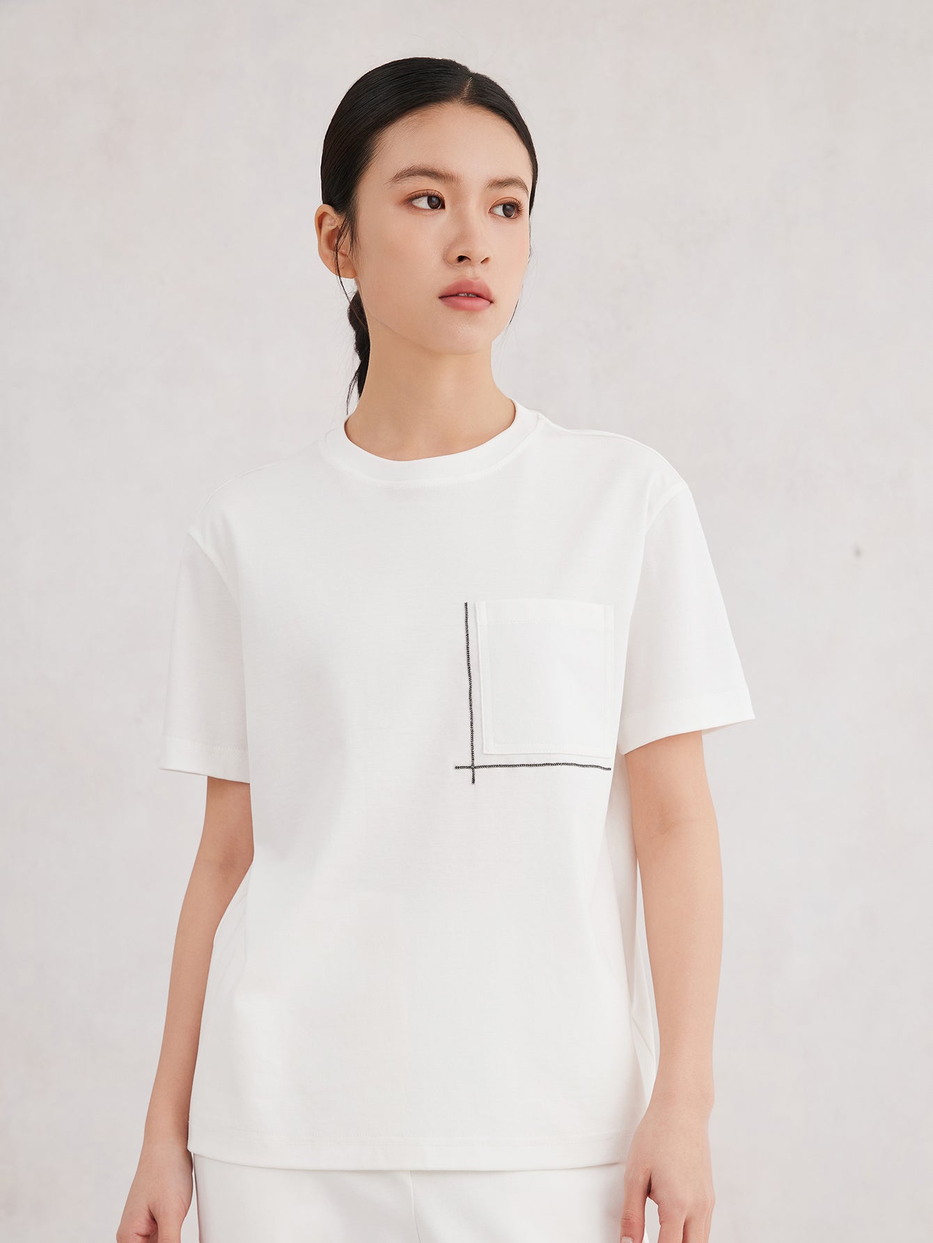 Cut from 100% pure cotton, this short-sleeve T-shirt offers breathable ease with a crisp, structured silhouette. A single chest pocket is accented by a geometric sketch detail—subtle yet expressive, adding a quiet layer of artistry. Designed to move with your style, it wears well tucked in, layered, or simply left loose.