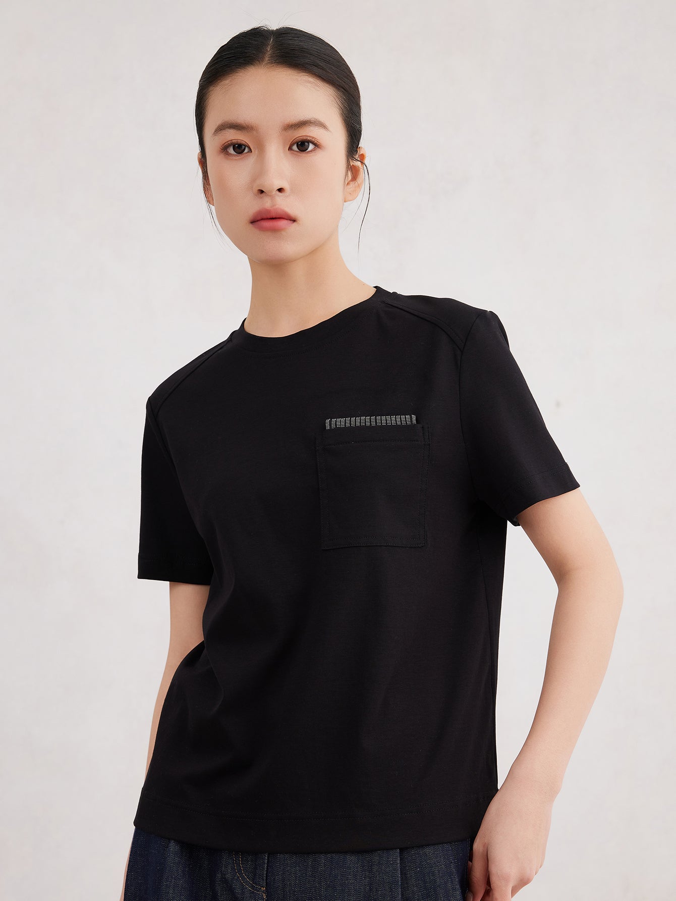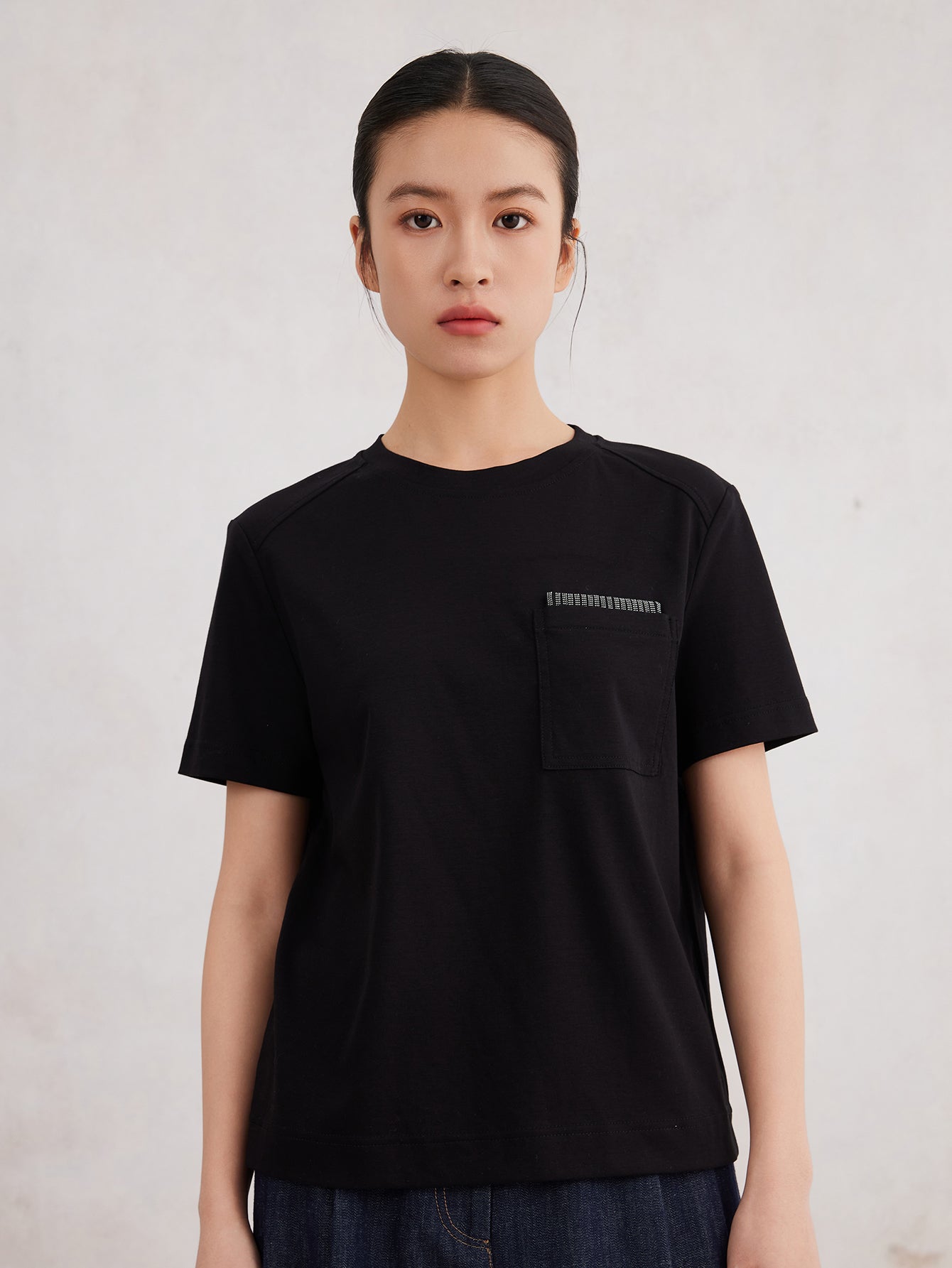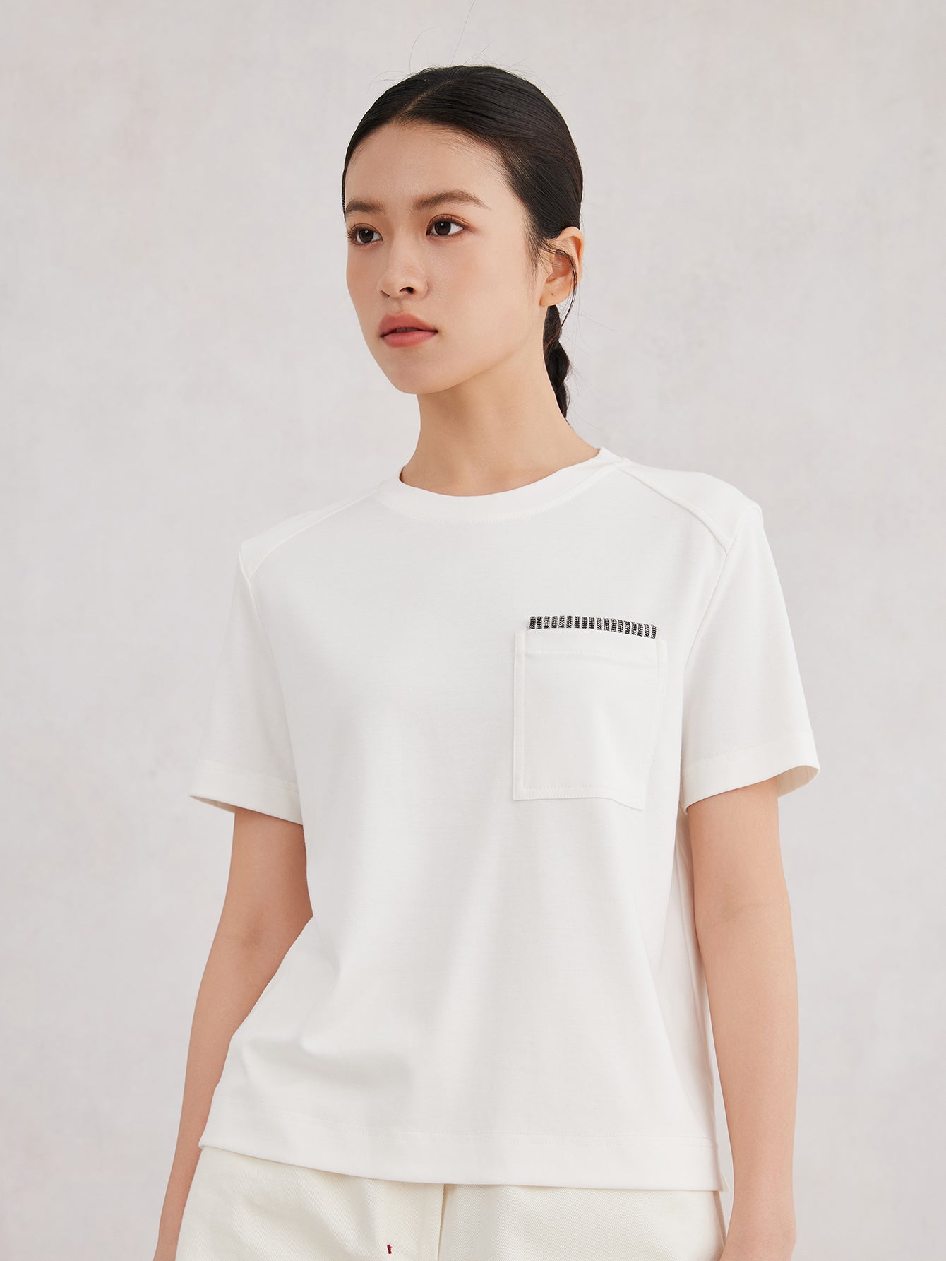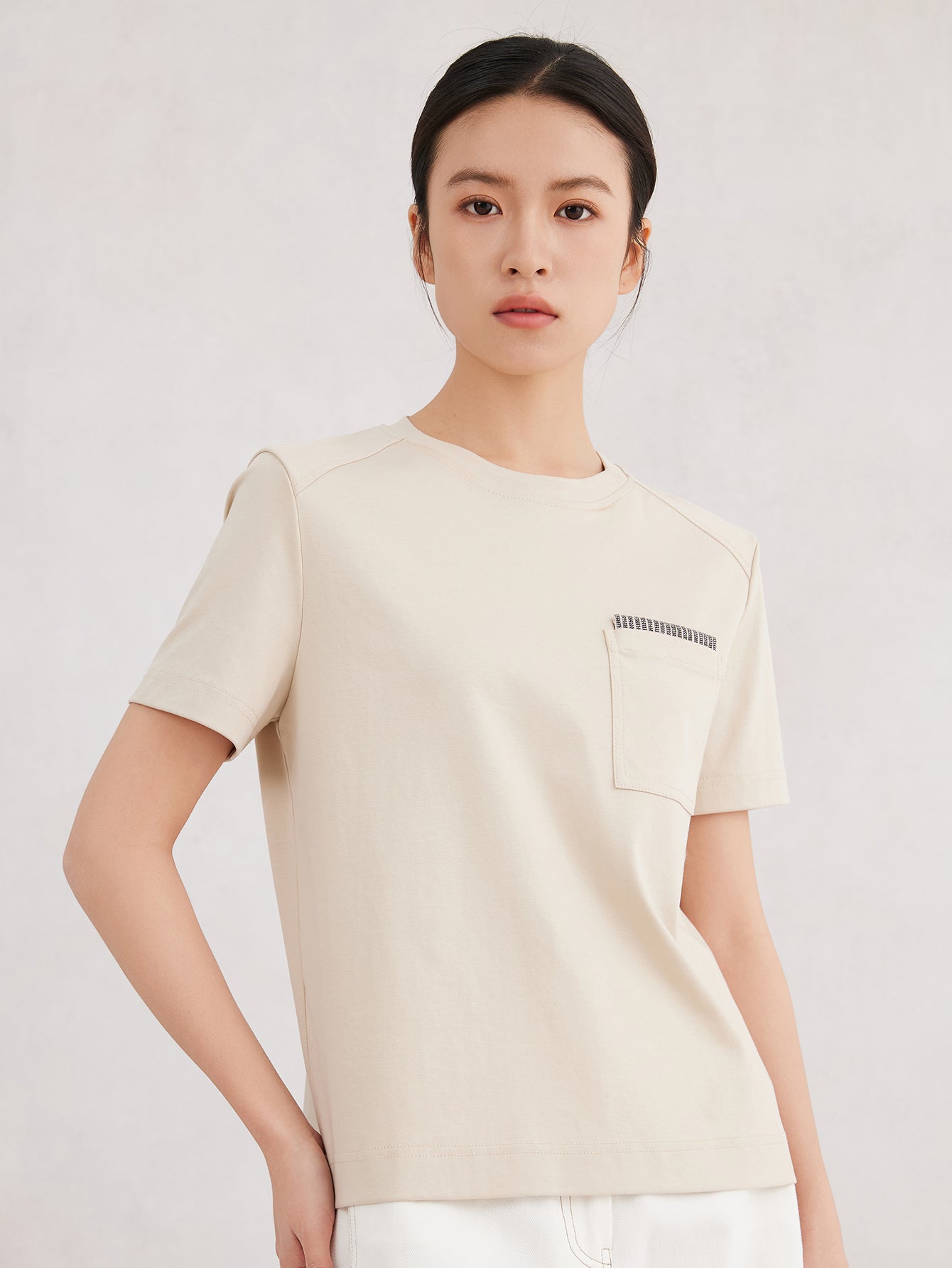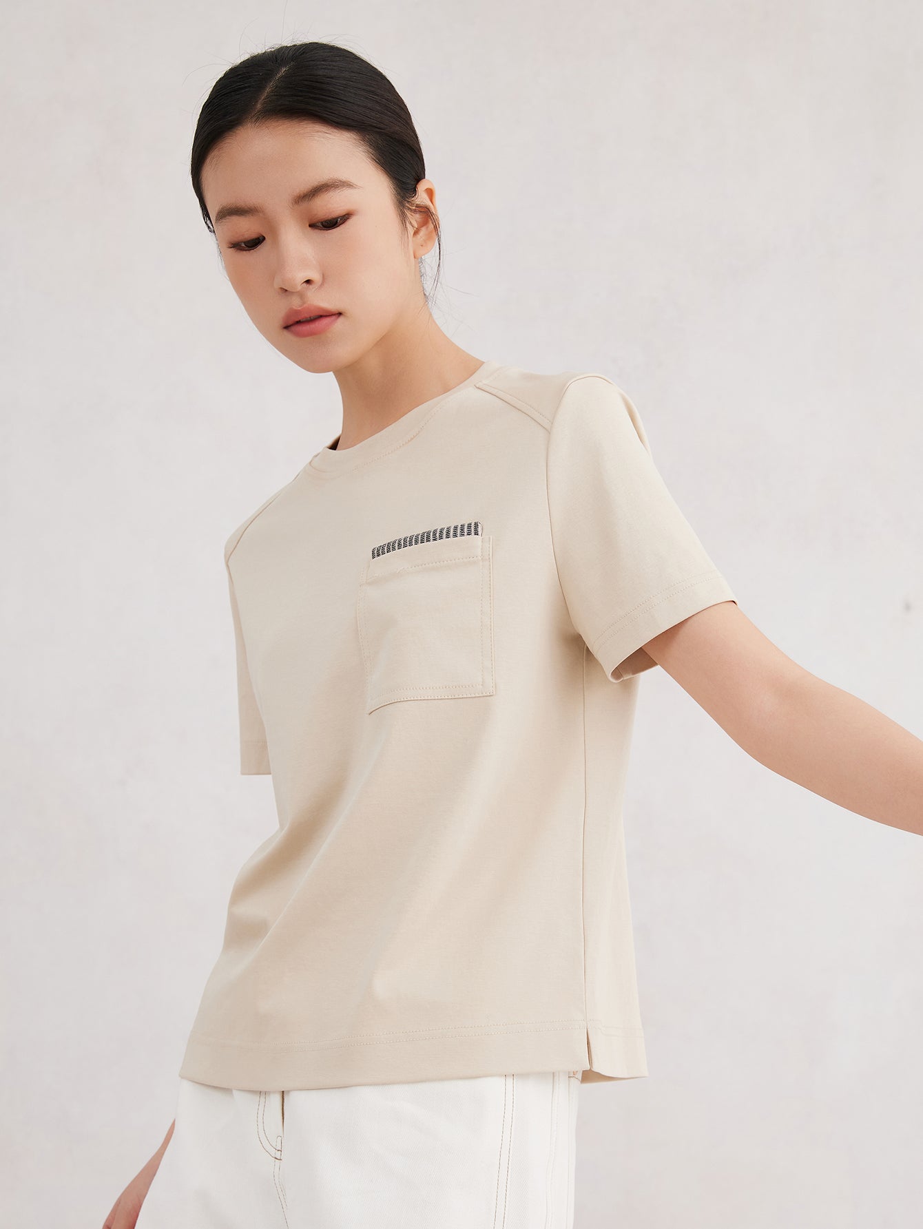 Crafted from 100% premium Pima cotton, this short-sleeve T-shirt offers an ultra-soft feel and natural breathability. The fabric is smooth yet structured, giving a clean silhouette. A small chest pocket with subtle stitch detail adds a touch of modern refinement. Ideal for casual everyday styling in spring and summer.