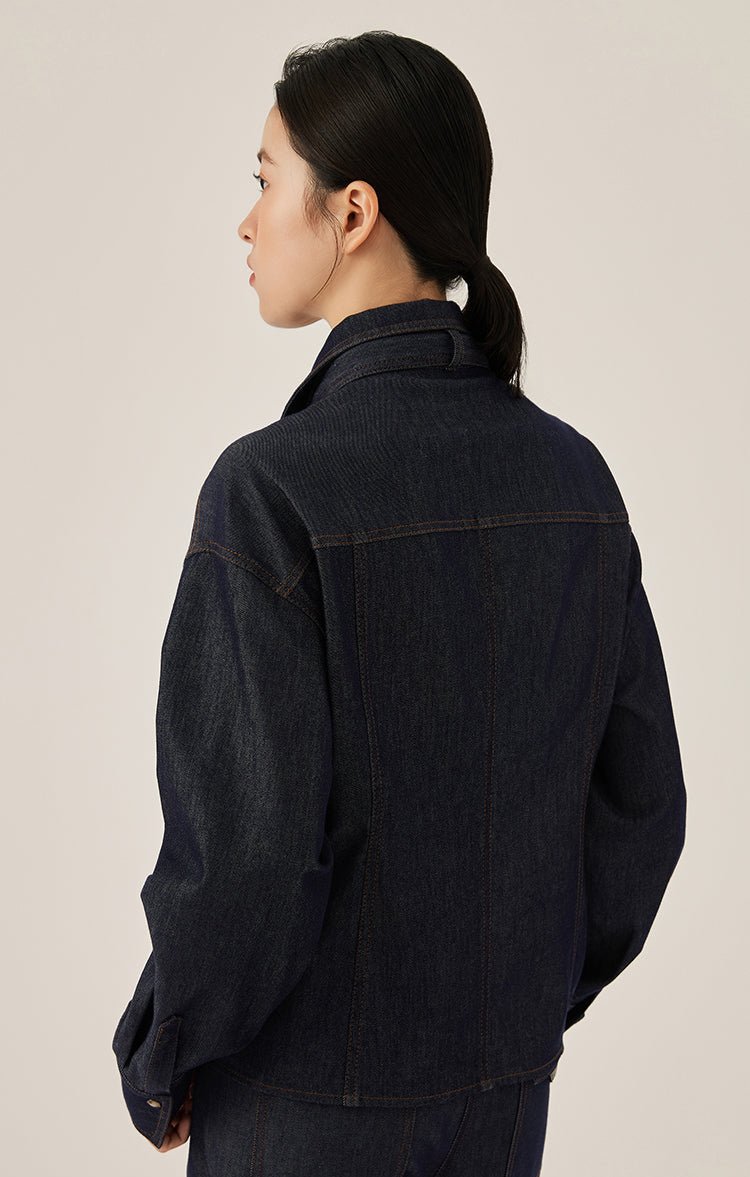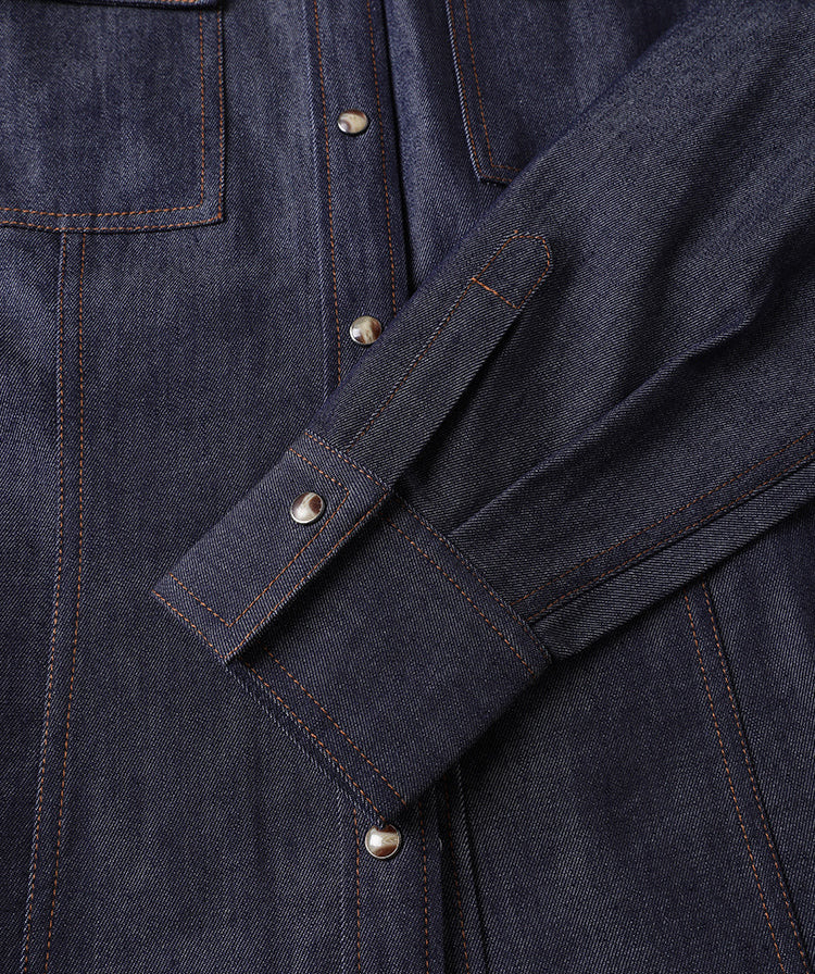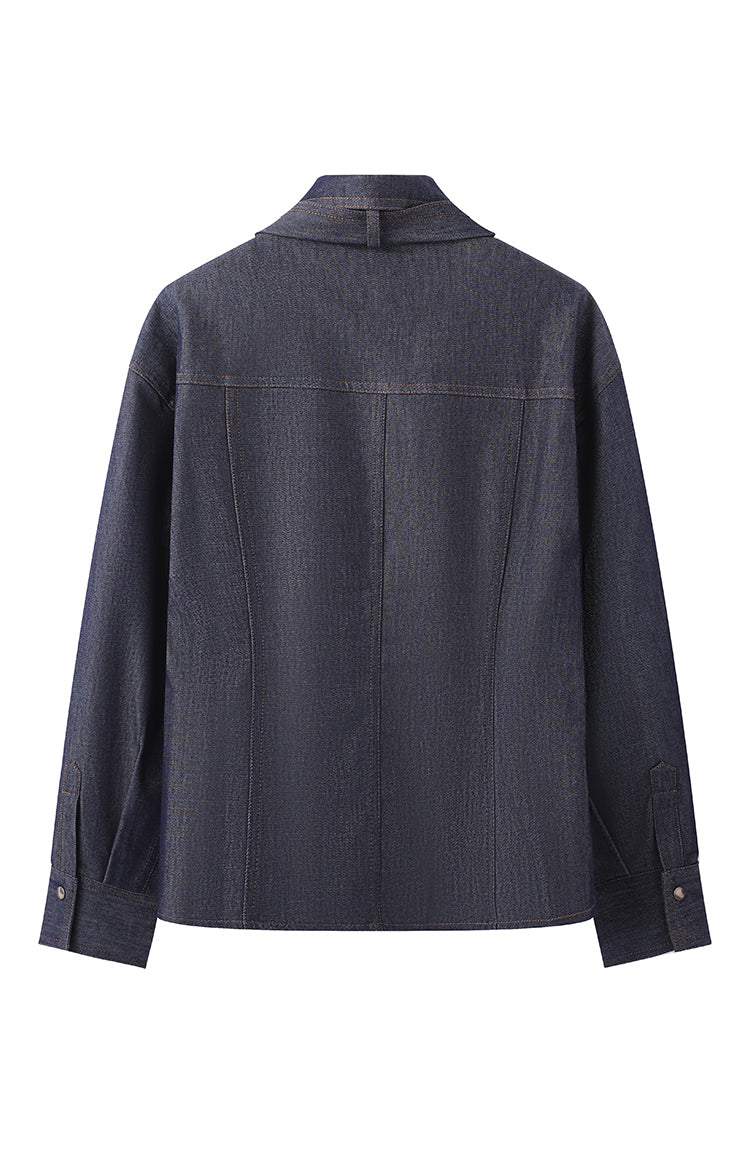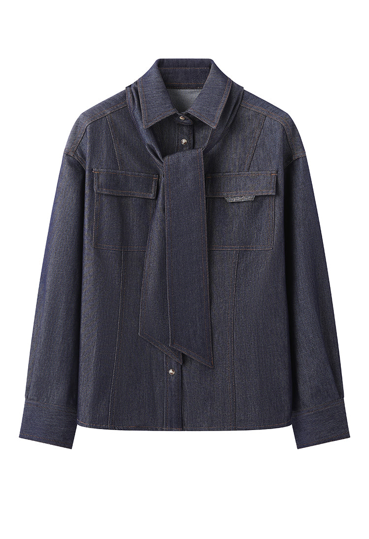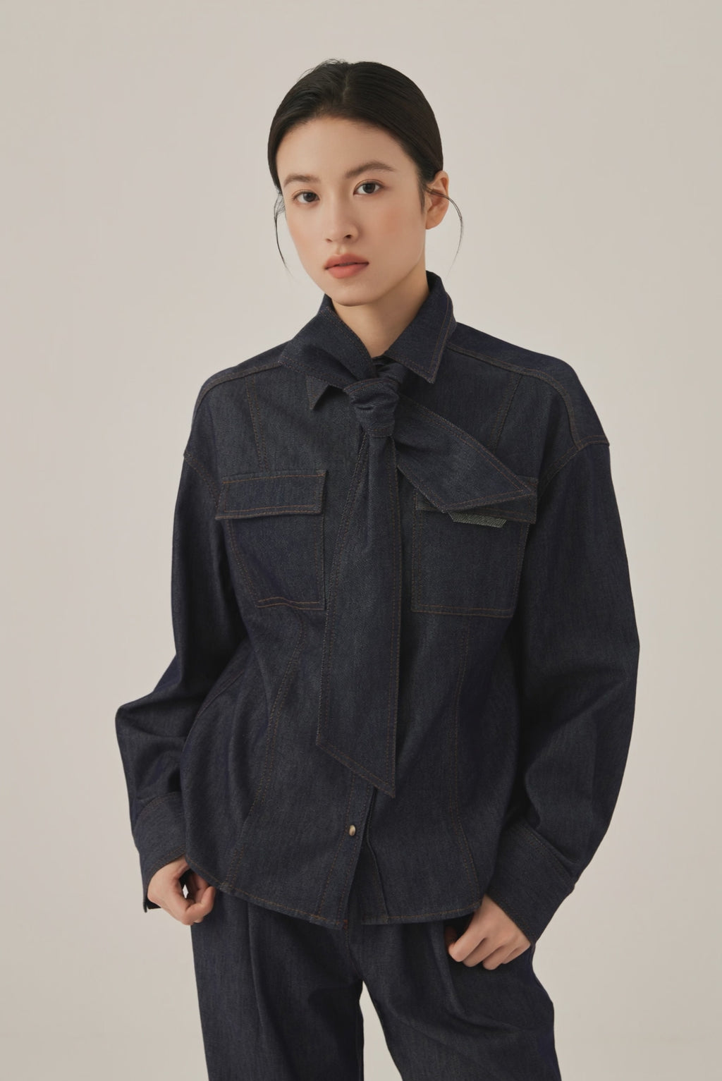 This dark-wash denim shirt adds a refined twist to a wardrobe classic with its dramatic bow-tie neckline. Tailored from a soft yet structured cotton blend, the piece features utility-inspired flap pockets and tonal topstitching. Ideal for elevating your casual style or making a subtle statement in layered looks.