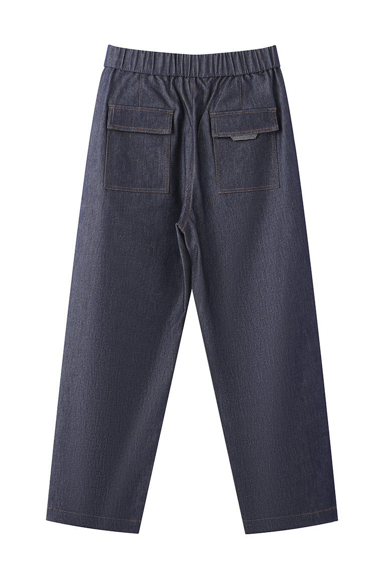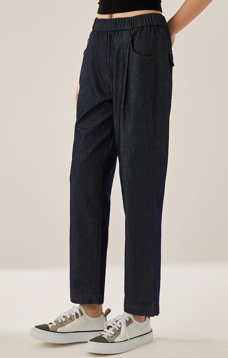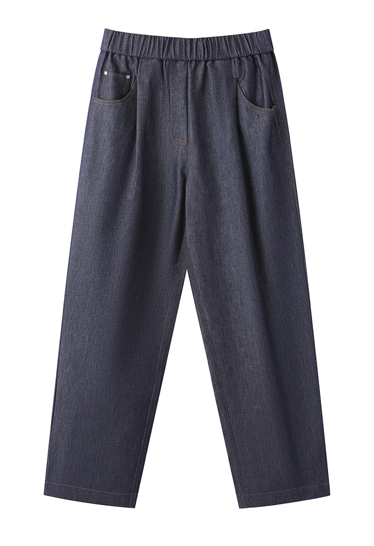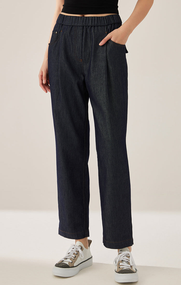 Designed for ease and structure, these dark wash denim pants feature a relaxed straight-leg silhouette with a gathered elastic waistband for effortless comfort. Cut from a durable cotton blend, the fabric balances structure with slight stretch for all-day wear. Side and back pockets add casual function, while subtle front pleats offer a tailored edge.