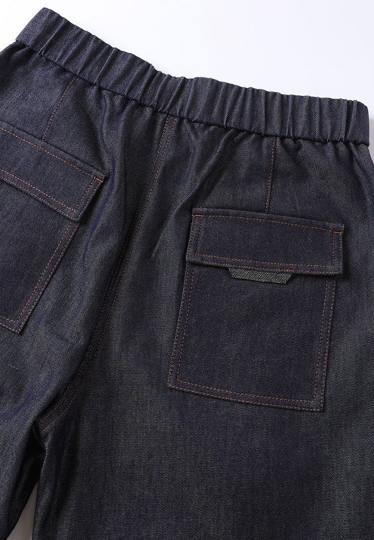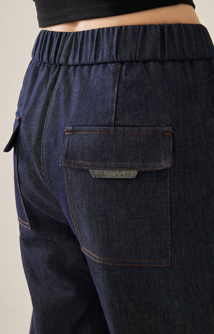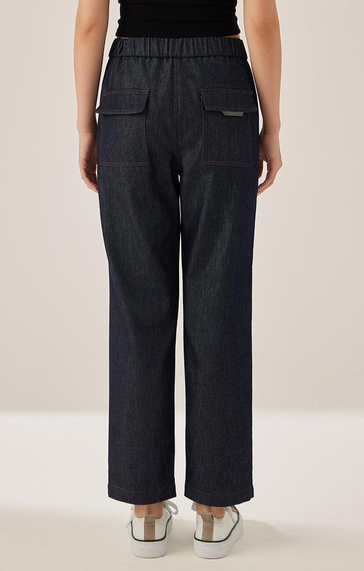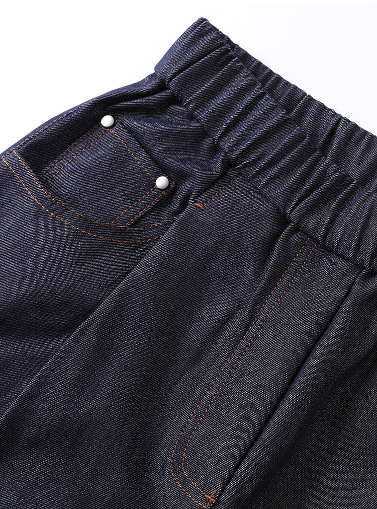 Designed for ease and structure, these dark wash denim pants feature a relaxed straight-leg silhouette with a gathered elastic waistband for effortless comfort. Cut from a durable cotton blend, the fabric balances structure with slight stretch for all-day wear. Side and back pockets add casual function, while subtle front pleats offer a tailored edge.