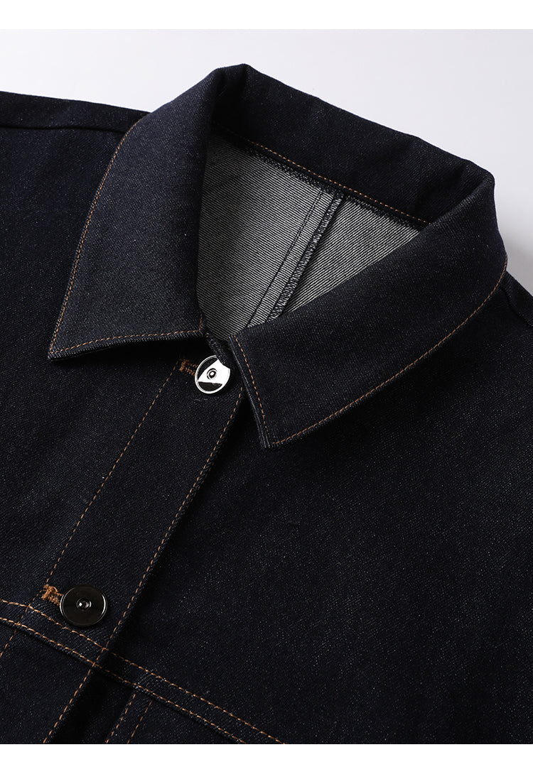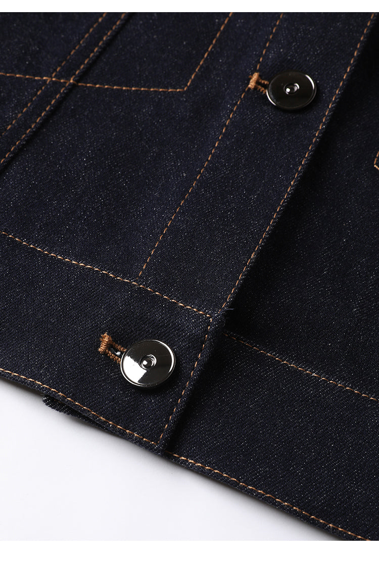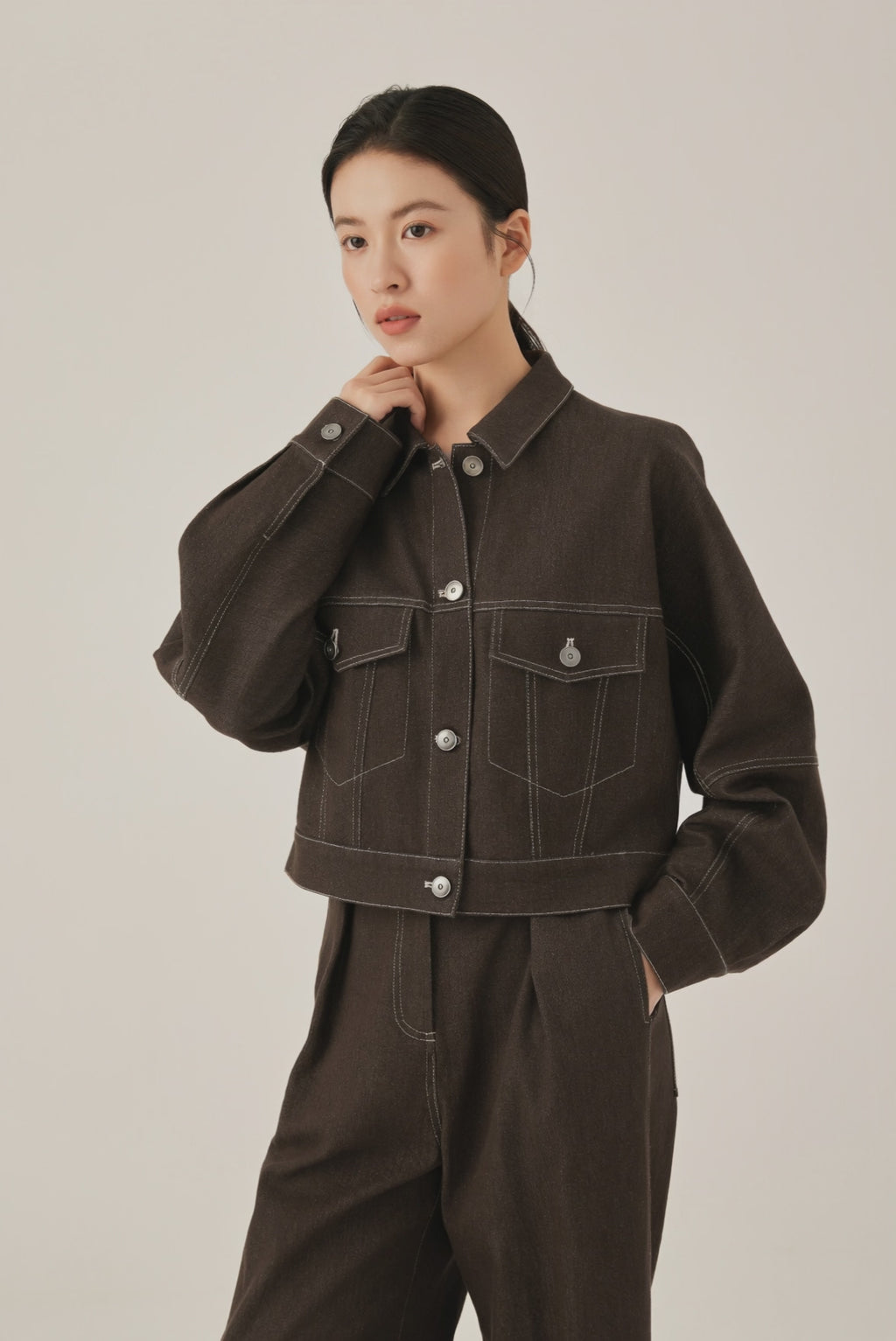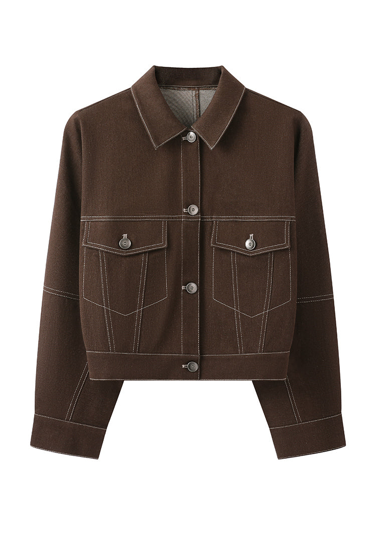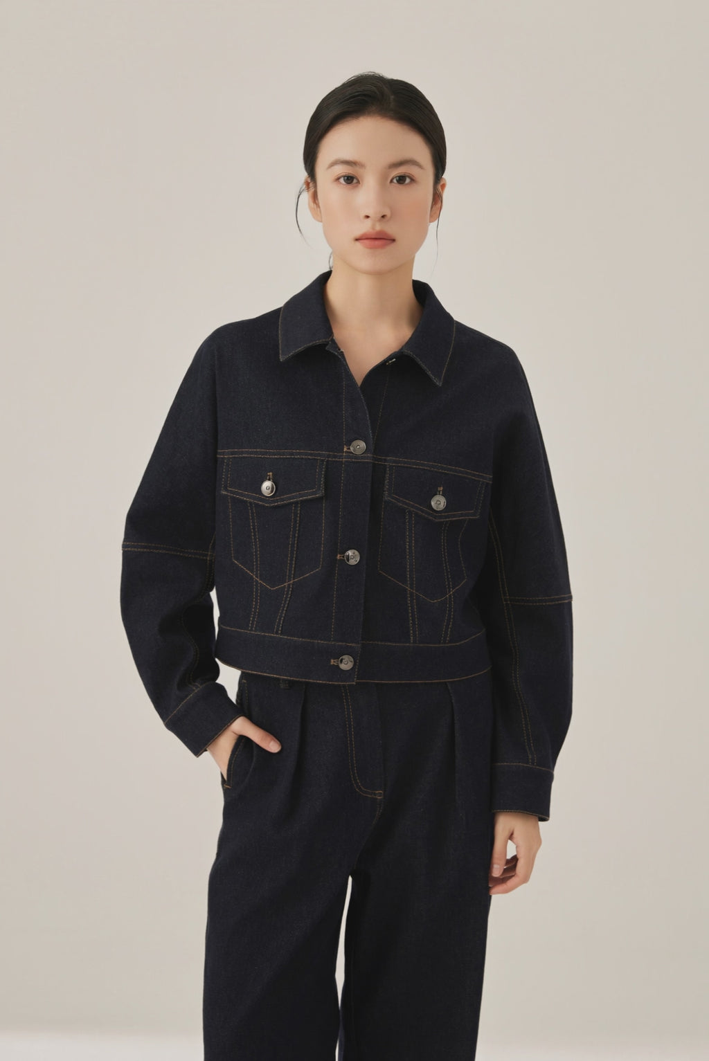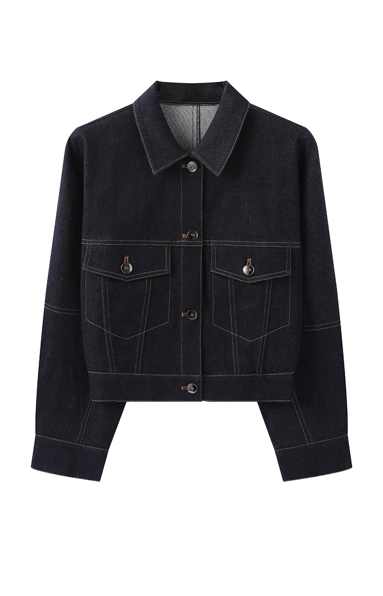 This cropped denim jacket features bold contrast stitching and a structured silhouette for a refined casual look. Crafted with a cotton-blend shell and fully lined with breathable 100% cotton, it offers all-day comfort with a touch of stretch. The buttoned chest pockets and tailored seams enhance its utility-inspired elegance