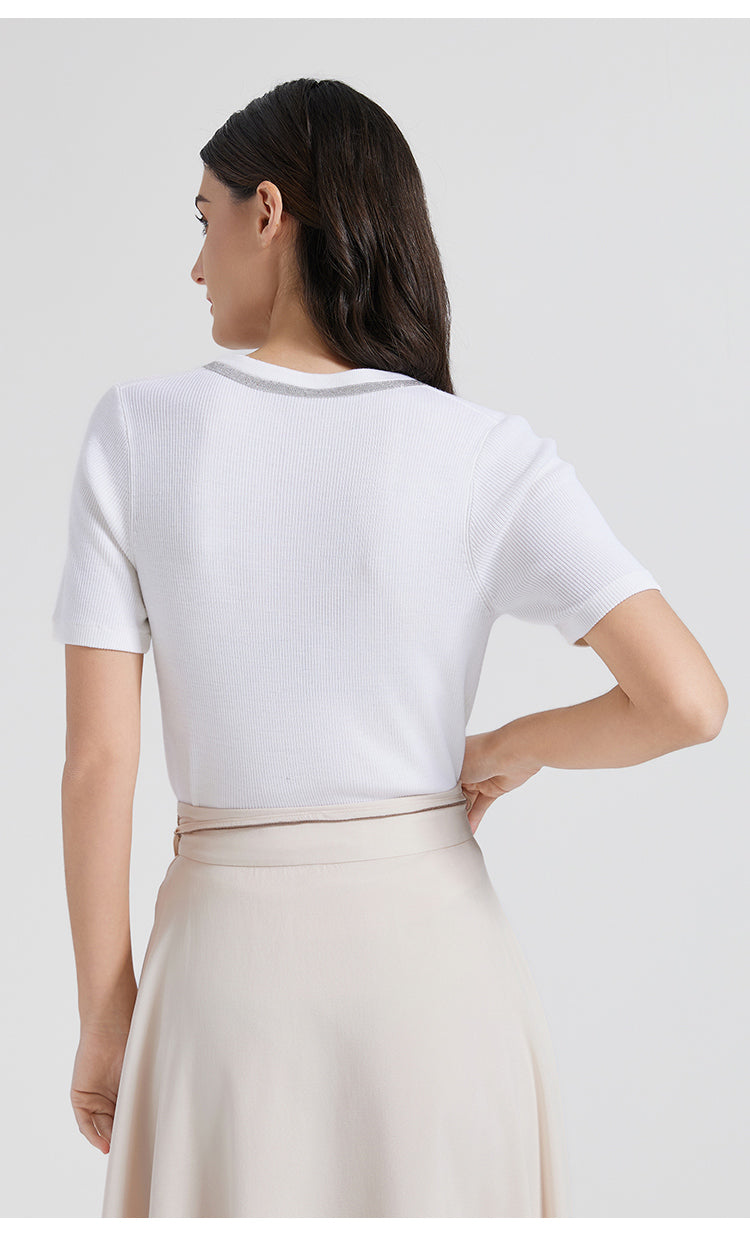 This short-sleeve knit top is crafted from a refined blend of 70% merino wool and 30% silk, delivering a soft yet structured texture. The U-shaped neckline is delicately accented with silver-toned rhinestones, adding a subtle touch of elegance. Lightweight and breathable, it helps you stay cool even on warm summer days. Blending the natural temperature-regulating properties of wool with the smooth sheen of silk, this piece offers both comfort and sophistication for everyday wear.