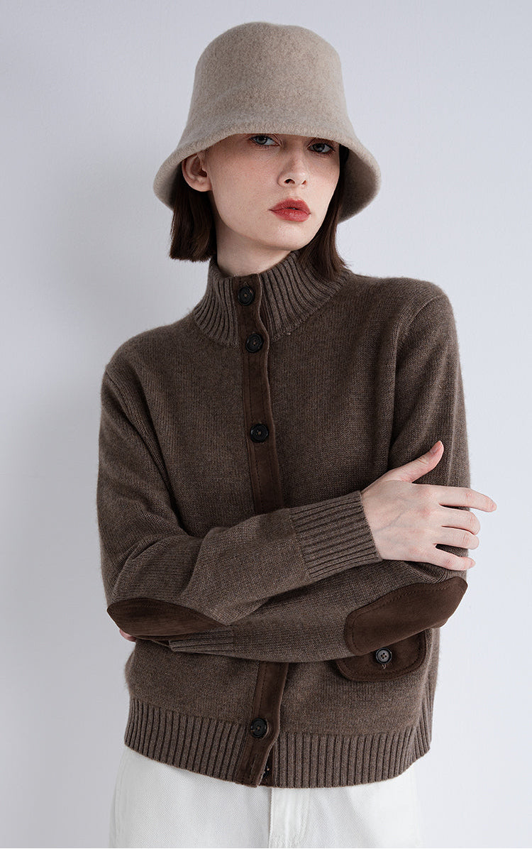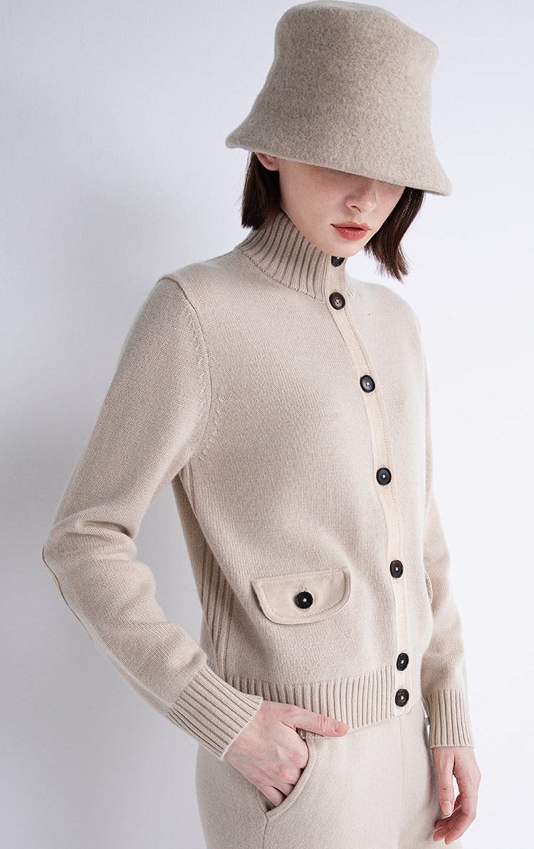 Design: High-neck cardigan with structured front placket and contrast pocket flaps