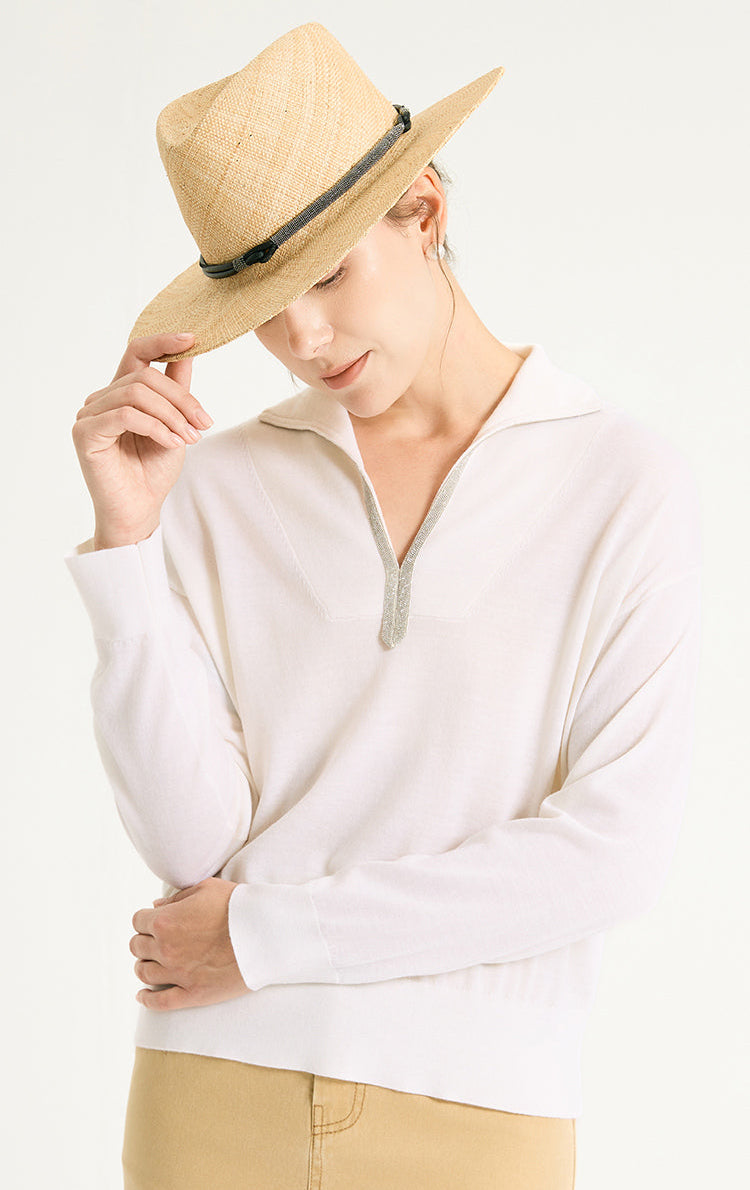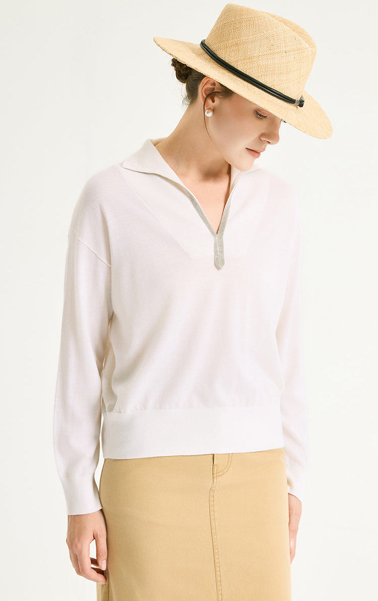 Wool Polo Knit Pullover With Silver Beaded Collar