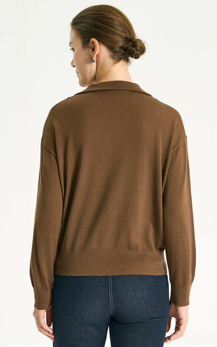 This luxurious pullover sweater is crafted from 100% pure wool, delivering natural warmth, breathability, and an exceptionally soft hand feel. Its refined polo-style collar is enhanced with delicate silver beads, offering a subtle, jewelry-like accent that elevates the minimalist design. The relaxed, dropped-shoulder silhouette ensures effortless comfort, while the fine 12-gauge knit provides a smooth texture and fluid drape. Rendered in a rich earthy brown tone, this versatile piece transitions seamlessly from casual styling to polished layering.