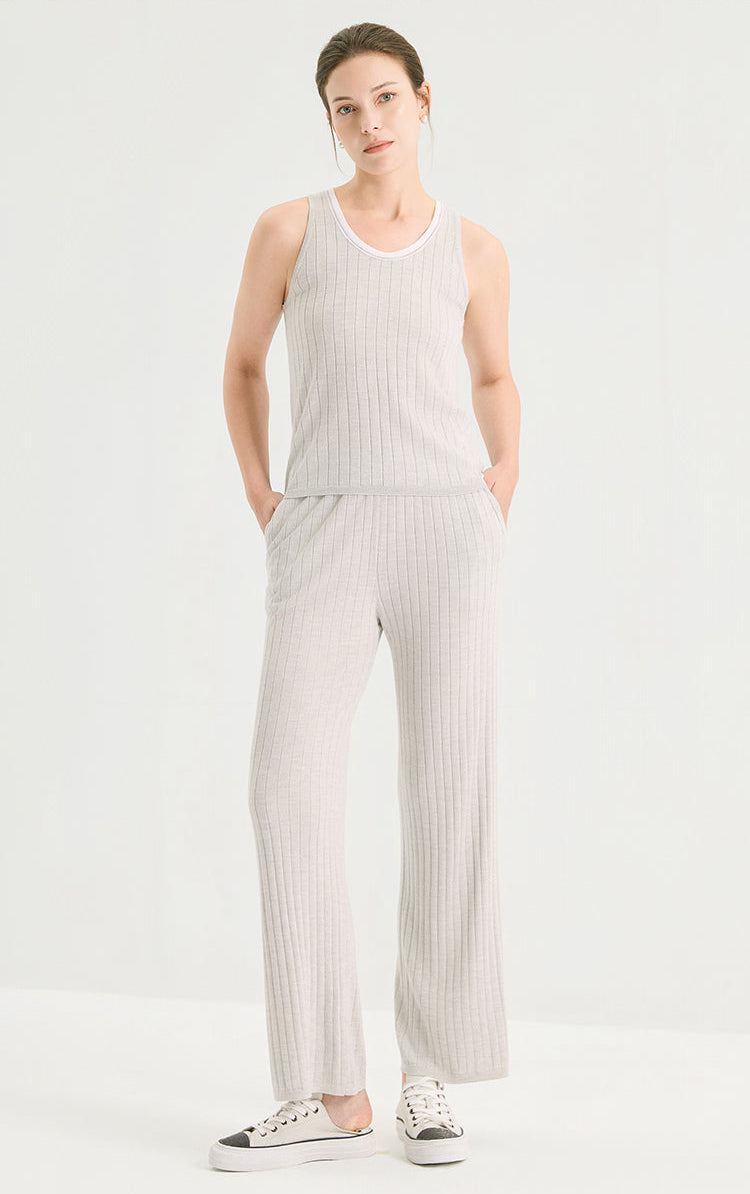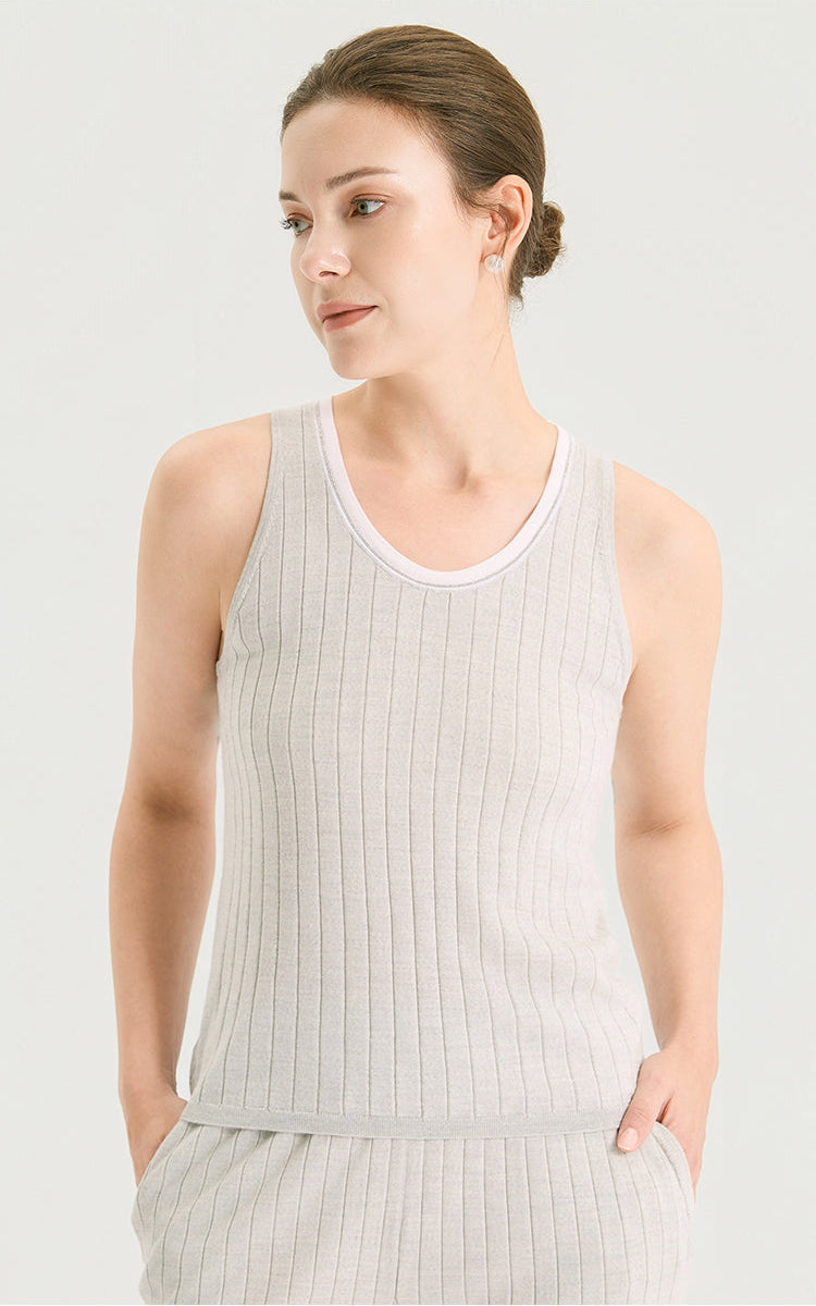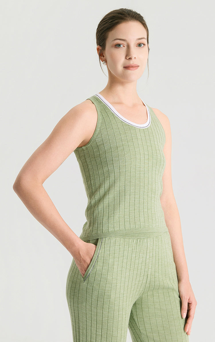 Wool Silk Fine Rib Knit Tank Top with Contrast Tipped Neckline