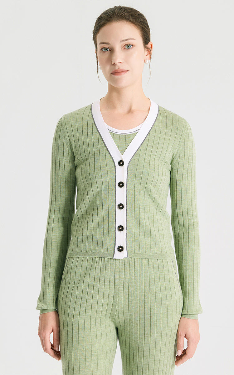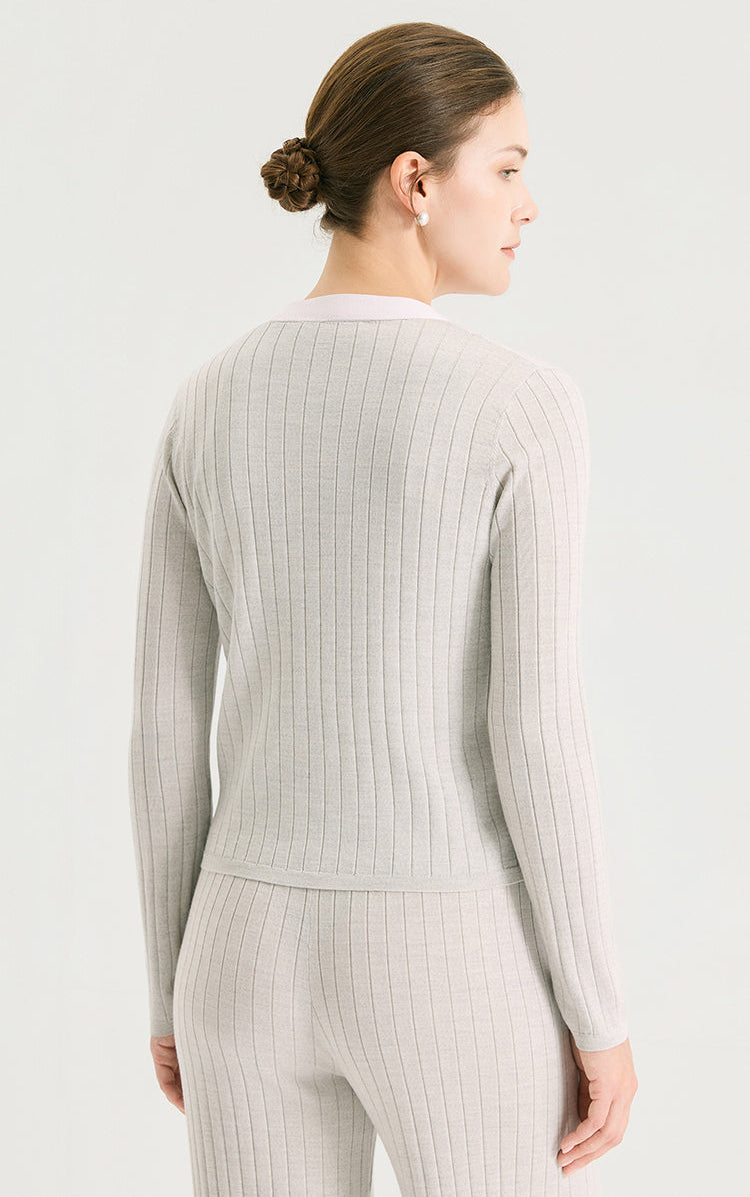 Crafted from a refined wool–silk blend, this V-neck cardigan is knitted in an ultra-fine 16-gauge rib that softly contours the body with natural elasticity. A contrasting white placket is finished with a delicate line of hand-integrated beads, introducing a subtle jewelry-like accent to the clean silhouette. Lightweight, breathable, and fluid in drape, it works equally well as a polished layering piece or worn on its own for understated elegance.