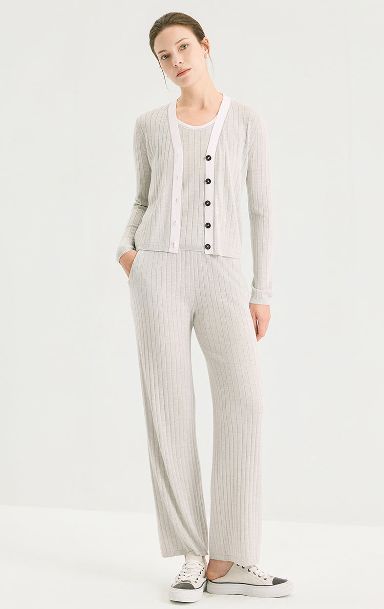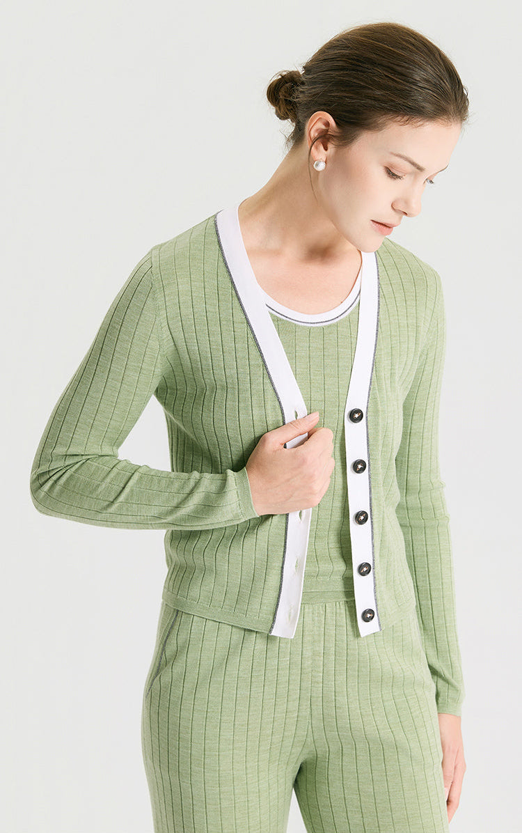 Wool Silk Ribbed Beaded V-Neck Cardigan