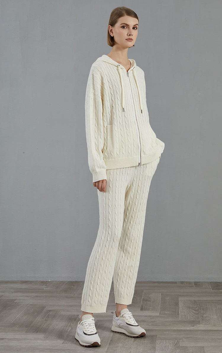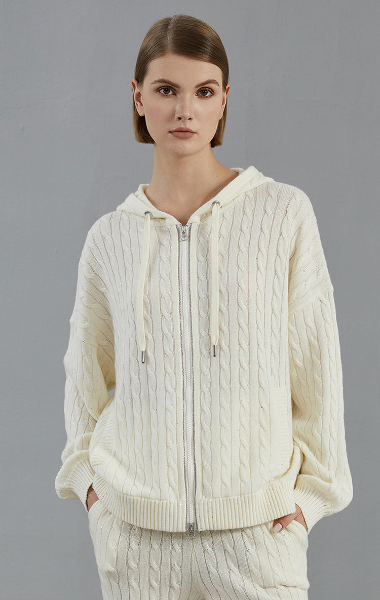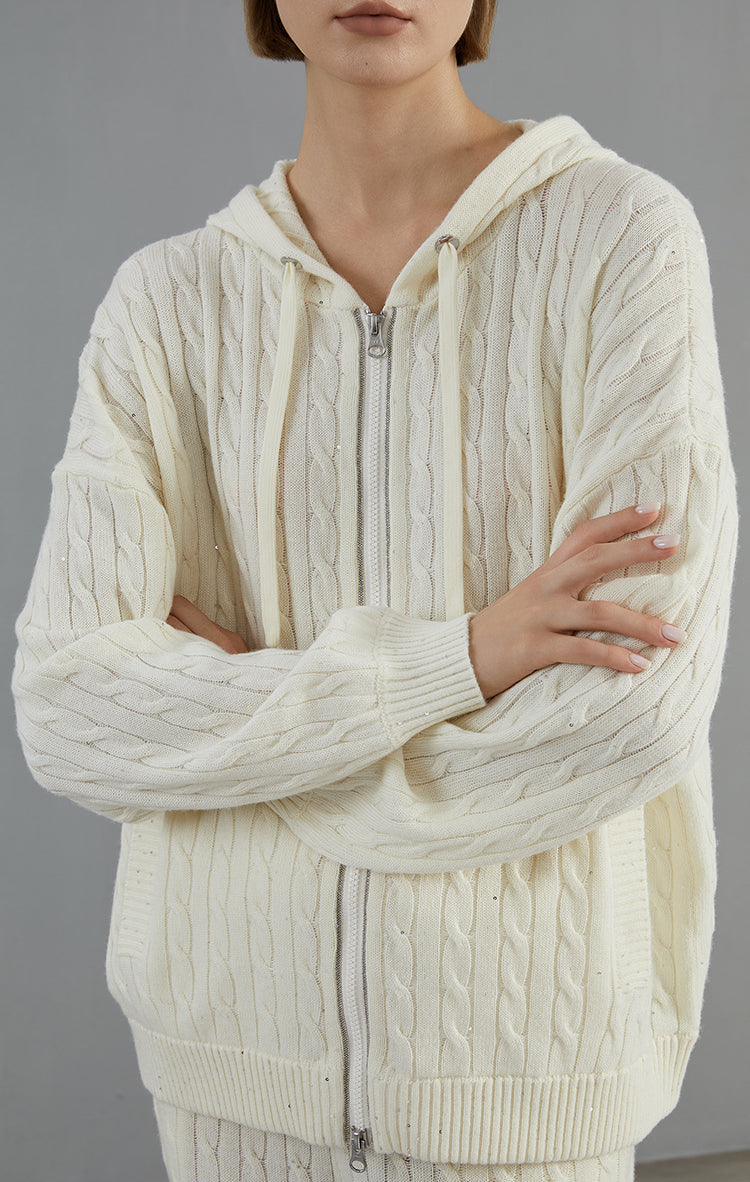 Women's Merino Wool Cable Knit Hooded Zip Cardigan